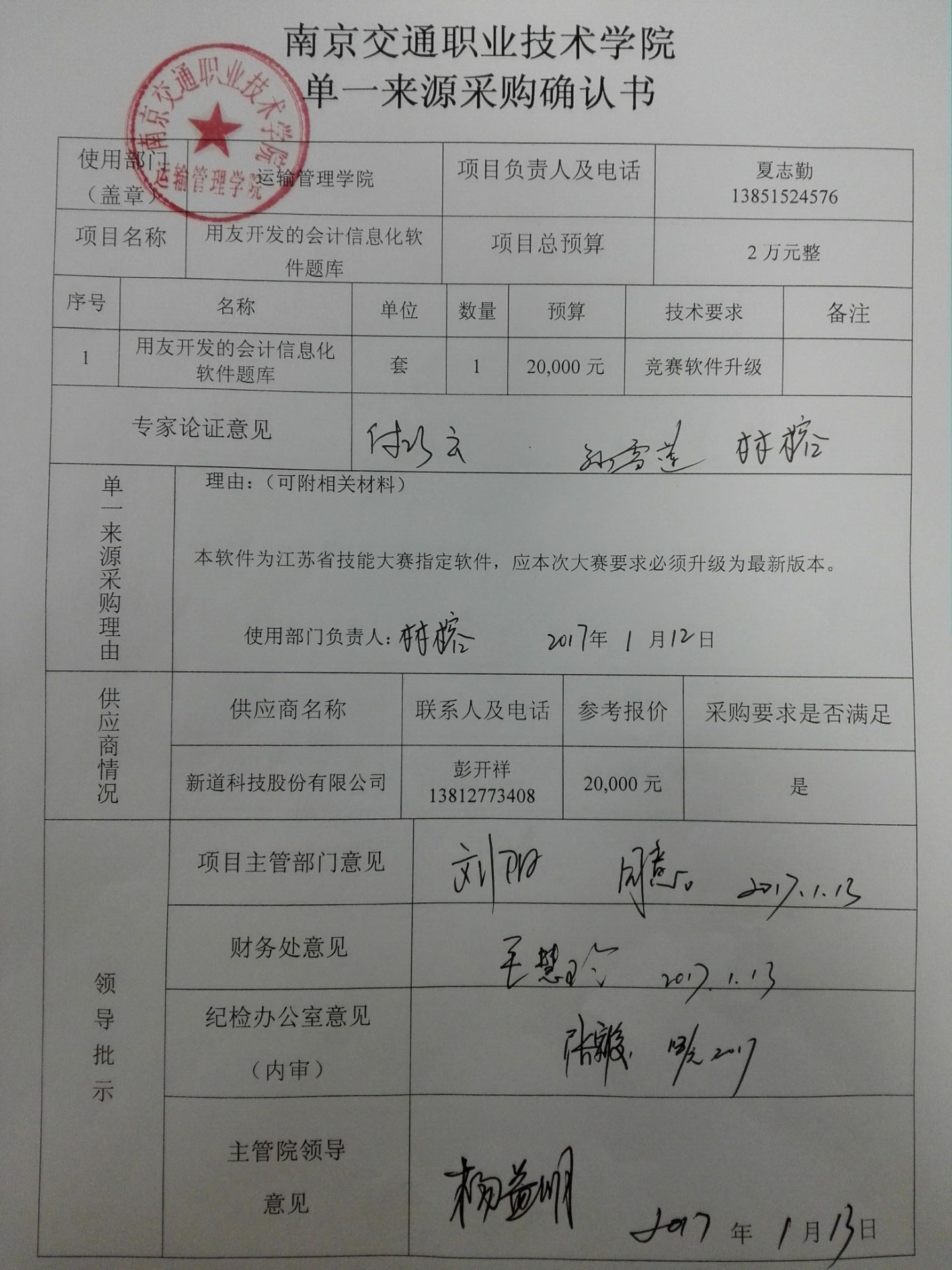 我部門受運(yùn)輸管理學(xué)院的委托,擬對該部門委托的采購編號為JY2017008號會計技能大賽信息化題庫項目實施院級集中采購。本部門根據(jù)采購人的實際申報情況,擬對該項目采用單一來源采購方式。