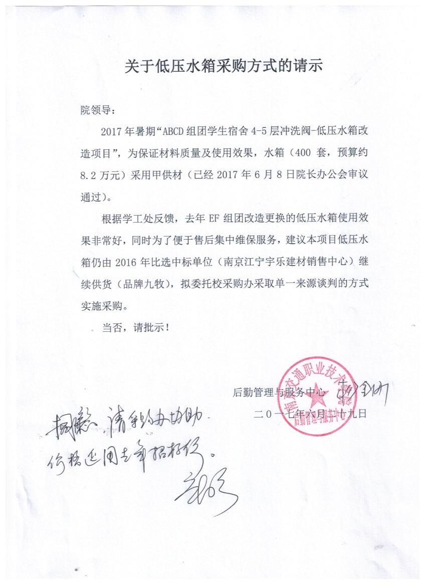 物資采購管理辦公室受后勤管理與服務(wù)中心的委托,對2017年暑期“A、B、C、D組團(tuán)學(xué)生宿舍4-5層沖洗閥-低壓水箱改造項(xiàng)目”單一來源采購(采購編號JY2017079),現(xiàn)邀請貴單位參加談判,并提請注意以下事項(xiàng):