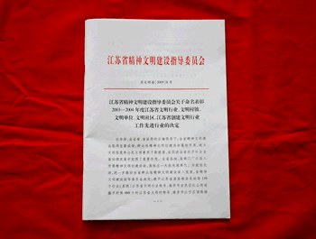 近日,根據(jù)蘇文明委[2005]8號(hào)文件《關(guān)于命名表彰2003—2004年度江蘇省文明行業(yè)、文明村鎮(zhèn)、文明單位、文明社區(qū)、江蘇省創(chuàng)建文明行業(yè)工作先進(jìn)行業(yè)的決定》,我院被江蘇省精神文明建設(shè)指導(dǎo)委員會(huì)表彰為“2003—2004年度省文明單位”。