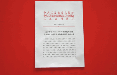 根據(jù)蘇委工[2006]27號(hào)文件,我院黨委組織宣傳部部長(zhǎng)張永春同志被中共江蘇省委宣傳部、中共江蘇省委省級(jí)機(jī)關(guān)工委、江蘇省司法廳聯(lián)合表彰為“2001—2005年省級(jí)機(jī)關(guān)法制宣傳教育工作先進(jìn)個(gè)人”。