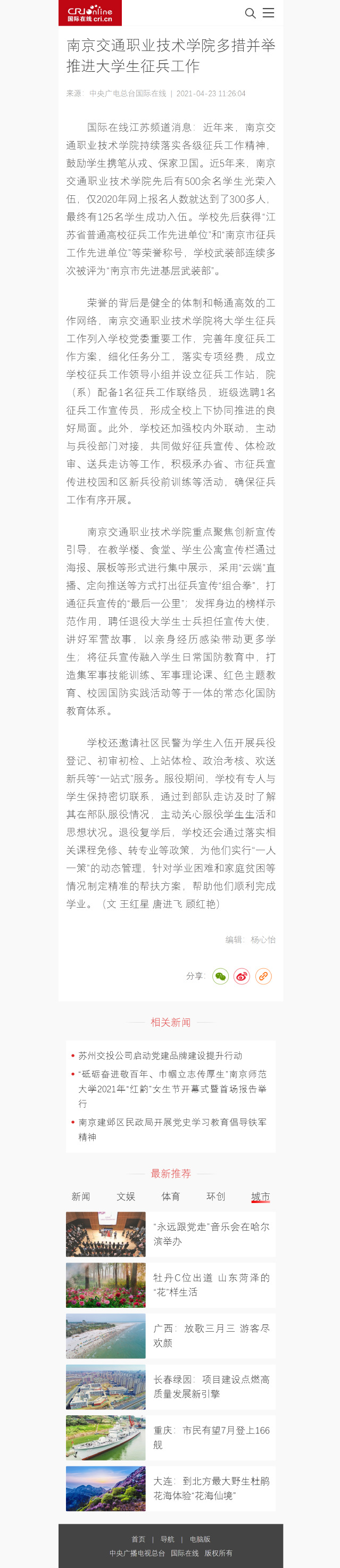【中央廣電總臺國際在線】南京交通職業(yè)技術(shù)學(xué)院多措并舉推進(jìn)大學(xué)生征兵工作