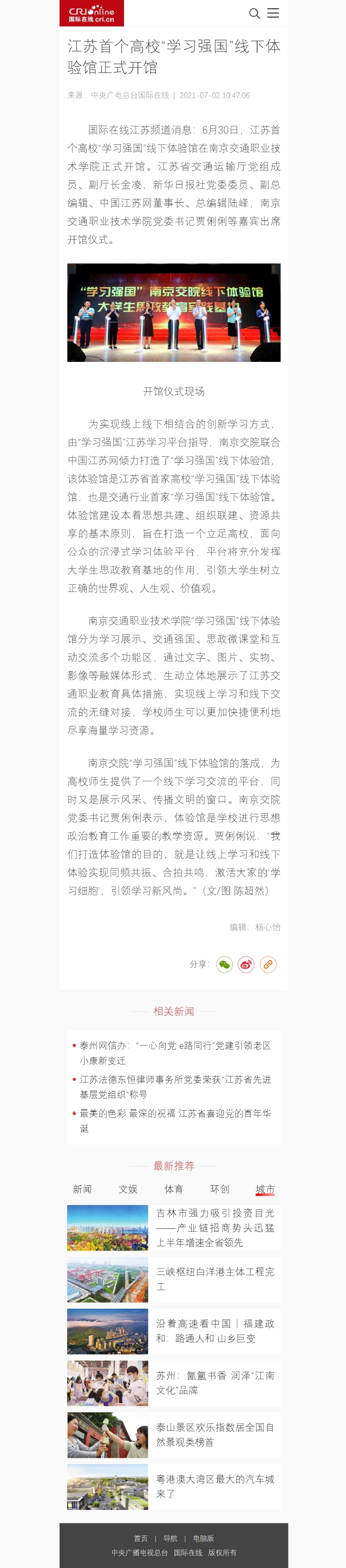 【中央廣電總臺(tái)國(guó)際在線】江蘇首個(gè)高?!皩W(xué)習(xí)強(qiáng)國(guó)”線下體驗(yàn)館正式開館