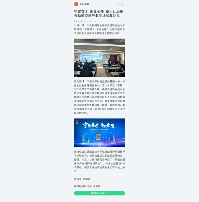 【紫金山時(shí)政】寧聚英才 樂業(yè)金陵 市人社局舉辦軌道交通產(chǎn)業(yè)專場(chǎng)就業(yè)沙龍