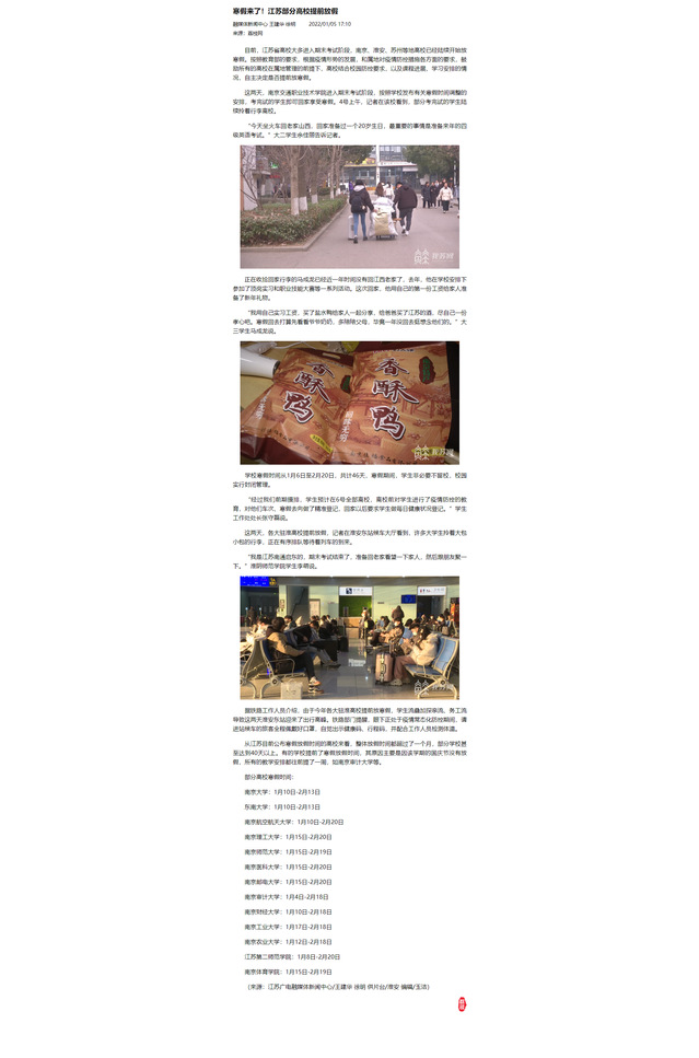 【荔枝網(wǎng)】寒假來了!江蘇部分高校提前放假