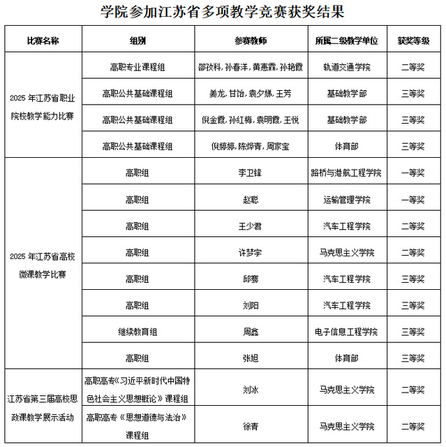 近日,江蘇省多項(xiàng)教學(xué)競賽評選結(jié)果陸續(xù)揭曉。我院教師積極踴躍參與,在各類賽事中斬獲多項(xiàng)榮譽(yù),充分展現(xiàn)了我院教師隊(duì)伍優(yōu)秀的教學(xué)水平和良好的精神風(fēng)貌。