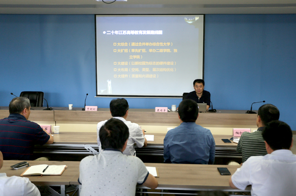 為推動“三嚴三實”專題教育,加強學院“十三五”規(guī)劃研究和編制工作, 9月17日下午,學院舉辦干部專題培訓會,邀請江蘇省教育廳高等教育處處長袁靖宇博士作《“十三五”期間高等教育面臨的重大挑戰(zhàn)和應對》專題報告。全體院領導、全體中層干部,學院“十三五”規(guī)劃編制領導小組及辦公室成員,各院系部教研室主任、學工辦主任共同聆聽了報告。報告會由黨委書記賈俐俐主持。
