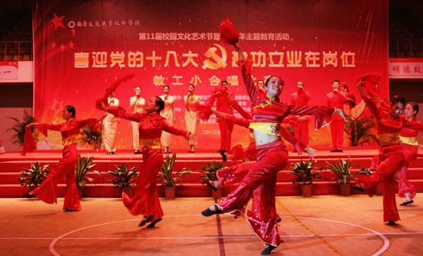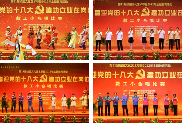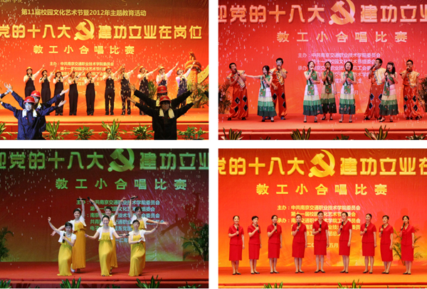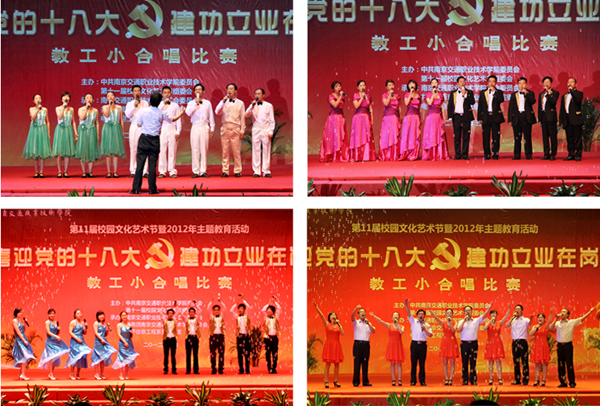 全院各黨總支及分工會(huì)共組織了十三支代表隊(duì)參賽,近130名教職工穿上精心準(zhǔn)備的服裝,登臺(tái)獻(xiàn)唱。從激昂高亢的《團(tuán)結(jié)就是力量》到舒緩輕柔的《南屏晚鐘》、從紅色經(jīng)典《游擊隊(duì)之歌》到青春動(dòng)感的《最炫民族風(fēng)》,教職工們用優(yōu)美的歌聲表達(dá)深切的愛國(guó)之情和喜迎十八大勝利召開的喜悅振奮之情,充分展示了在學(xué)院二次創(chuàng)業(yè)征途中同心同德,朝氣蓬勃、協(xié)作進(jìn)取的精神風(fēng)貌。演出精彩紛呈,高潮迭起,掌聲不斷。