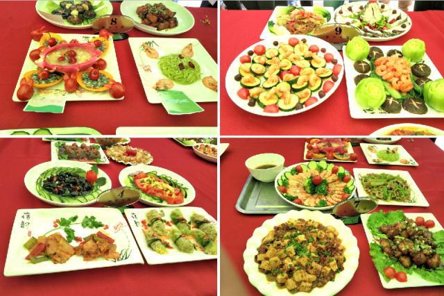 比賽中,選手需在規(guī)定時間內完成四道菜肴,其中三道菜肴需在18種指定原材料里自由搭配完成,另一道為自選菜肴。參賽教職工各顯神通、精心烹調,呈現(xiàn)了一場色、香、形、味俱佳的表演。經(jīng)過一個小時的比拼,每組選手均在規(guī)定時間順利完成了烹飪。