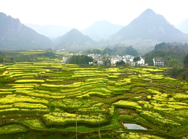 30日上午6時30分,微涼的晨風(fēng)吹送大巴車駛離學(xué)校,經(jīng)高速千百里,山路十八彎,耗時五小時,來到革命烈士許家朋的故鄉(xiāng)——安徽績溪家朋鄉(xiāng)。映入眼簾的是逶迤起伏的群峰下白墻黛瓦一片安寧祥和,層層疊疊的油菜花海中人影綽綽,好一幅美麗動人的春景圖。