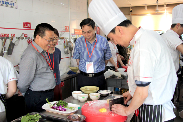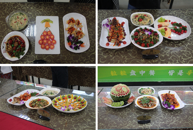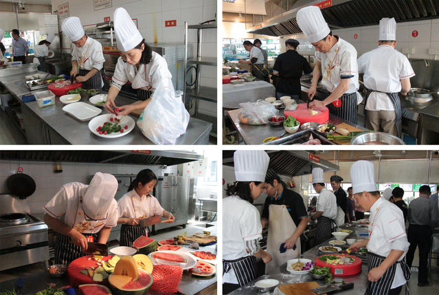 比賽中,選手需在規(guī)定時(shí)間內(nèi)完成,三道淮揚(yáng)菜(大煮干絲、菊花魚、泡椒牛蛙)、一道水果拼盤。參賽教職工各顯神通、精心烹調(diào),呈現(xiàn)了一場(chǎng)色、香、形、味俱佳的表演。經(jīng)過一個(gè)半小時(shí)的比拼,每組選手均在規(guī)定時(shí)間順利完成了烹飪和水果拼盤。