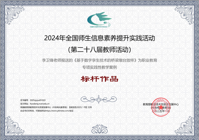 近日,教育部教育資源與發(fā)展中心公布了2024年全國師生信息素養(yǎng)提升實踐活動的作品評定結果,我院路橋與港航工程學院李衛(wèi)鋒老師提交的《基于數(shù)字孿生技術的橋梁墩臺放樣》實踐性教學案例獲得“標桿作品”榮譽。