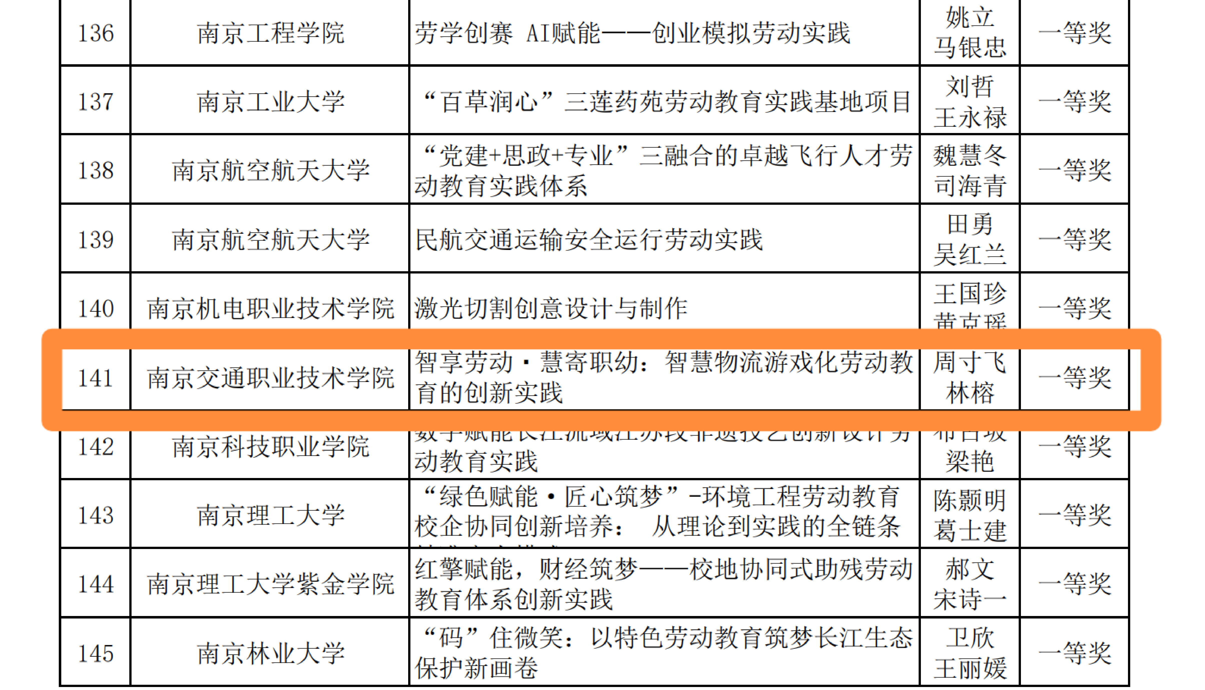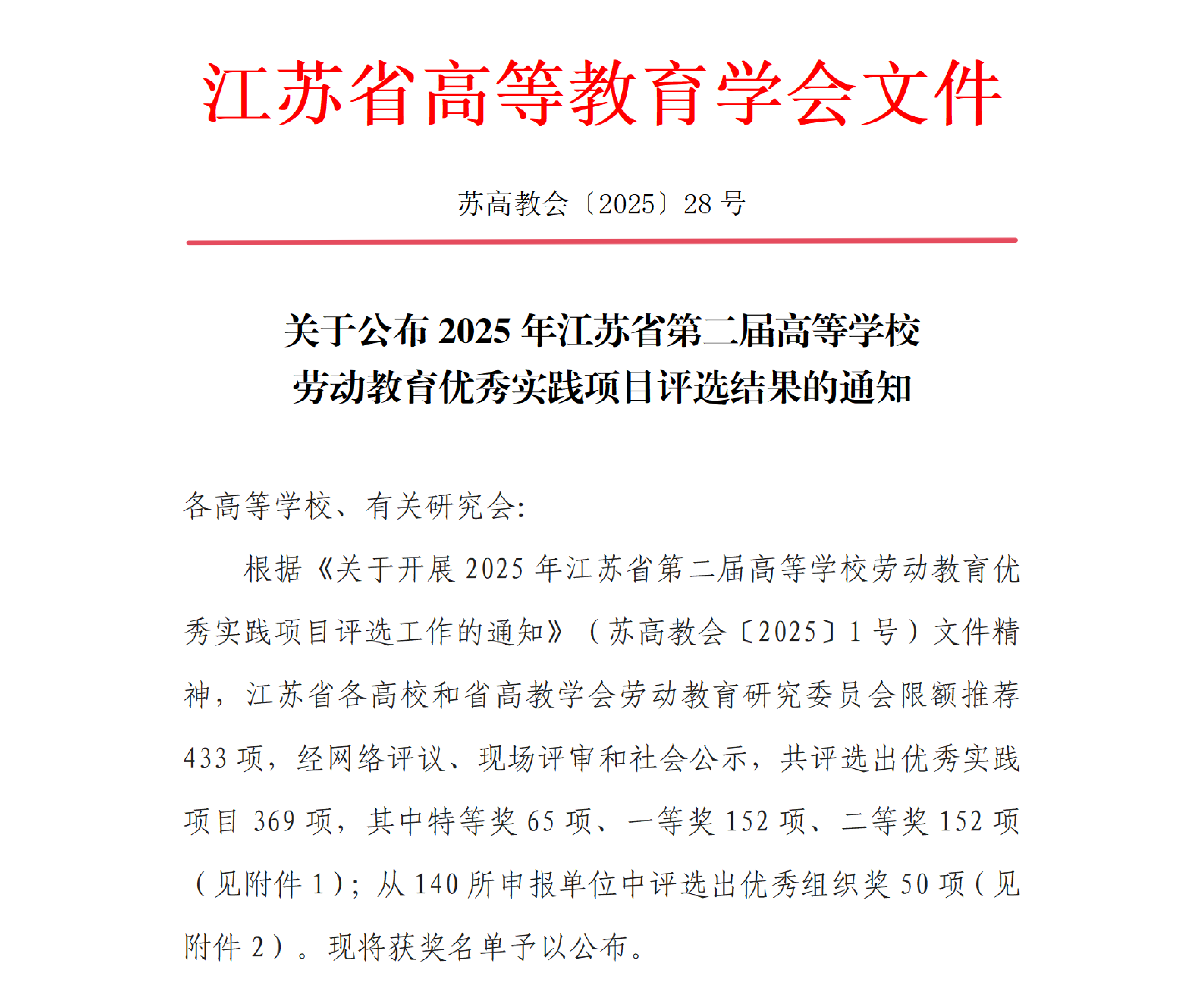 近日,江蘇省高等教育學(xué)會公布2025年江蘇省第二屆高等學(xué)校勞動教育優(yōu)秀實踐項目評選結(jié)果,我校《智享勞動?慧寄職幼:智慧物流游戲化勞動教育的創(chuàng)新實踐》(作者:周寸飛、林榕等)項目榮獲一等獎。