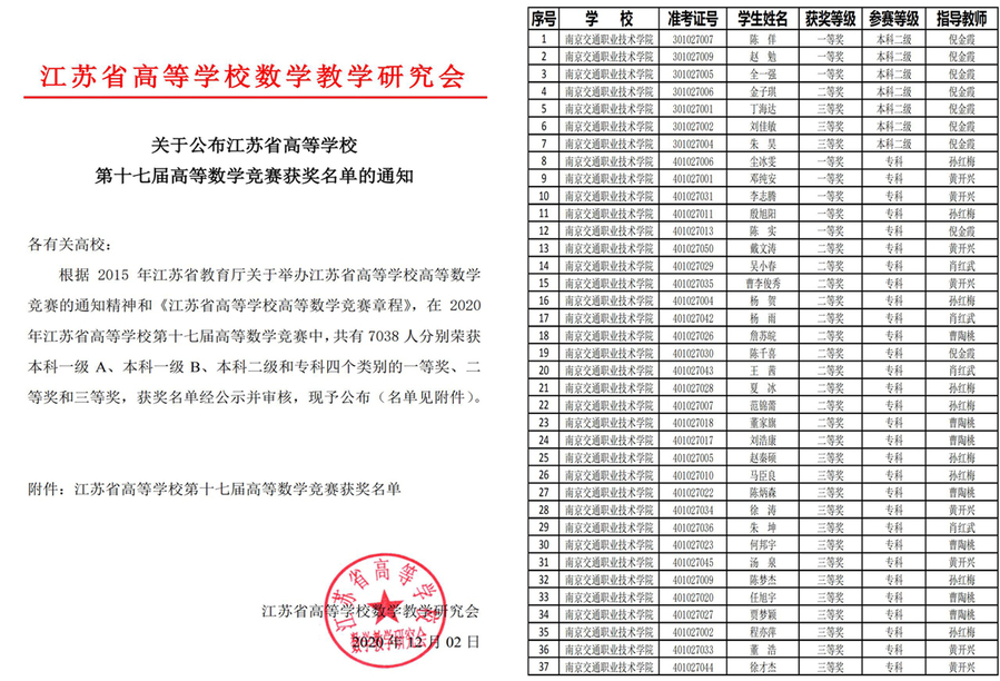 江蘇省高等學(xué)校第十七屆高等數(shù)學(xué)競賽于今年11月7日舉行。近日, 從江蘇省高等數(shù)學(xué)競賽組委會傳來喜訊,在本次競賽中,我院選送的74名參賽學(xué)生喜獲佳績,共有49人獲獎。其中專科組65人中有 5人獲一等獎,13人獲二等獎,25人獲三等獎;本科組9人中2人獲二等獎,4人獲三等獎。獲獎率達到66%,超出本次競賽平均獲獎率16個百分點。