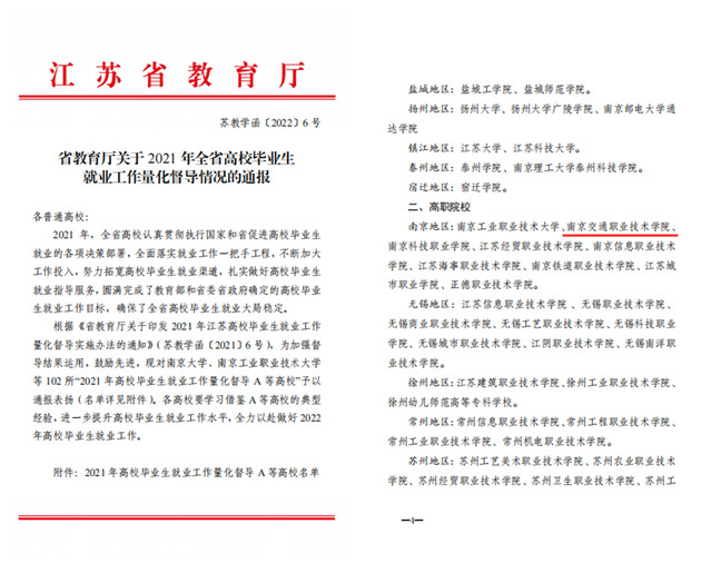 近日,省教育廳發(fā)布《關(guān)于2021年全省高校畢業(yè)生就業(yè)工作量化督導(dǎo)情況的通報》(蘇教學(xué)函〔2022〕6號),學(xué)院獲評2021年高校畢業(yè)生就業(yè)工作量化督導(dǎo)A等次。這是學(xué)院連續(xù)第二年獲評該項榮譽。