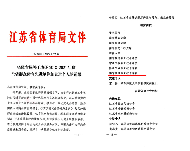 根據《江蘇省體育局關于表揚2018-2021年度全省群眾體育先進單位和先進個人的通報》【2022】27號文件精神,南京交通職業(yè)技術學院從全省百余所參評高校中脫穎而出,被評為2018-2021年度江蘇省群眾體育先進單位。