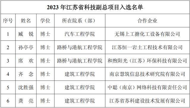 近日,江蘇省委人才辦、江蘇省科技廳公布了2023年江蘇省科技副總項(xiàng)目入選對(duì)象的名單(蘇科區(qū)發(fā)〔2023〕139號(hào)),學(xué)院共有6名博士教師入選,入選人數(shù)名列全省高職院校前列。
