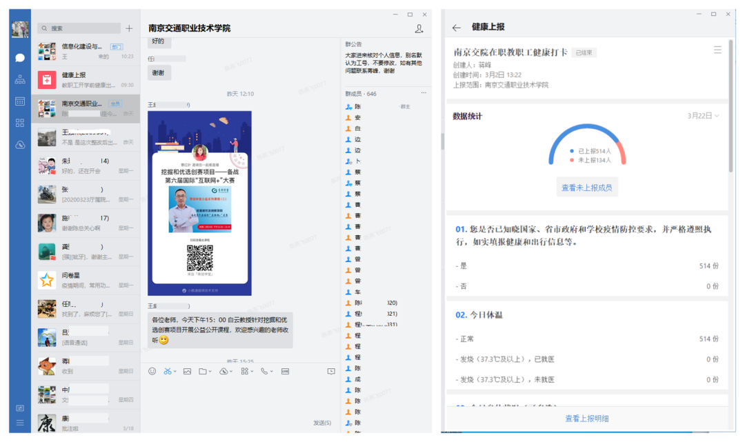 為及時采集師生健康信息,方便教職工在線辦公,學院在企業(yè)微信平臺上開通了官方賬號,全體教職工加入統(tǒng)一賬號,各類通知信息實現(xiàn)了快速“云送達”。同時,信息辦還配合人事處在平臺上線 “每日健康上報”應用,匯總全體教職工健康信息,有效解決了教職工疫情狀態(tài)信息采集難、匯總統(tǒng)計工作量大的難題。