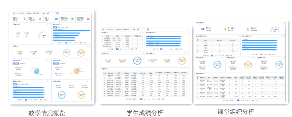 同時,為保證線上課程質量,信息辦開發(fā)了線上學情分析系統(tǒng),該系統(tǒng)能從教學情況概覽、用戶活躍分析、課堂組織分析、學生成績分析以及今日課堂分析等方面為教師提供課堂教學情況反饋。