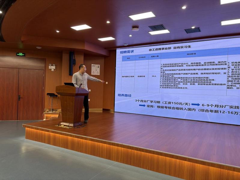 道路機(jī)械事業(yè)部李部長(zhǎng)則聚焦本次招聘的具體需求,系統(tǒng)介紹了招聘崗位的工作職責(zé)、任職要求、薪酬福利體系、職業(yè)發(fā)展通道以及完善的培養(yǎng)模式。在互動(dòng)環(huán)節(jié),同學(xué)們就工作地點(diǎn)、晉升機(jī)制、面試流程等關(guān)切問(wèn)題踴躍提問(wèn),李部長(zhǎng)一一給予了細(xì)致耐心的解答,現(xiàn)場(chǎng)氣氛熱烈融洽。