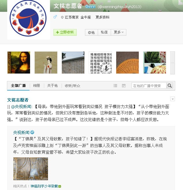 隨著科技的發(fā)展進(jìn)步,網(wǎng)絡(luò)已逐步成為人們交流思想、獲取信息、休閑娛樂(lè)的主要平臺(tái)和前沿陣地。尤其是青少年,受網(wǎng)絡(luò)文化的影響較為深刻。為貼近青年、貼近實(shí)際開展文明宣傳、引導(dǎo),利用網(wǎng)絡(luò)與時(shí)俱進(jìn)開展思想教育,我校致力于傳播文明新風(fēng)尚的志愿者們成立了“文銘志愿者”網(wǎng)絡(luò)文明志愿服務(wù)隊(duì)。他們以“文銘志愿者”微博為主陣地,大力傳播社會(huì)文明新風(fēng)尚,向社會(huì)傳遞正能量,并結(jié)合社會(huì)熱點(diǎn)開展正面評(píng)論和引導(dǎo),起到了積極的作用。
