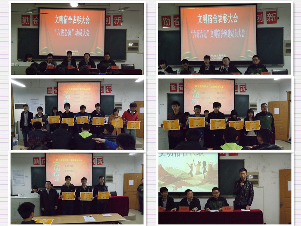 3月28日晚,機(jī)電工程學(xué)院2013—2014第一學(xué)期文明宿舍表彰大會(huì)暨開啟“六進(jìn)公寓”活動(dòng)動(dòng)員大會(huì)在明志樓302教室召開。機(jī)電工程學(xué)院黨總支書記米永勝、機(jī)電工程學(xué)院學(xué)工辦主任周昊明、機(jī)電工程學(xué)院輔導(dǎo)員宋杰出席了表彰大會(huì),全院15間獲獎(jiǎng)宿舍代表,各宿舍長、宿管會(huì)成員及自我管理基層組織人員參加本次大會(huì)。