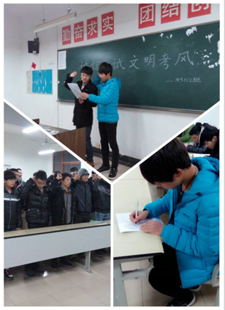 機(jī)電工程學(xué)院145012班舉行了“誠(chéng)信考試、文明考風(fēng)”主題班會(huì)和簽字、宣誓儀式,倡議全班同學(xué)誠(chéng)信考試,認(rèn)真溫課備考,杜絕考試作弊。