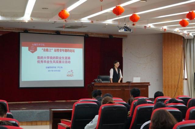 10月18日下午14時,運輸管理學院在明德樓報告廳舉行了“我的大學我的職業(yè)生涯路”優(yōu)秀畢業(yè)生風采展示報告會,2006級物流管理(國際貨運代理)專業(yè)學生尹江偉與全校近300名大學生,以“奮斗的青春、永無止境”為題進行了深入的交流。