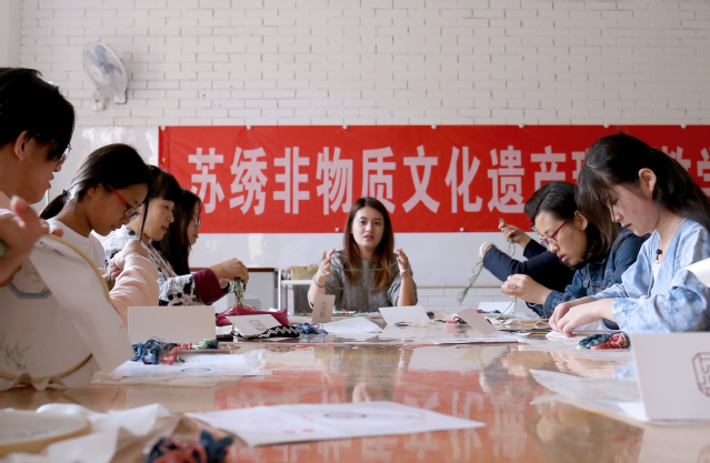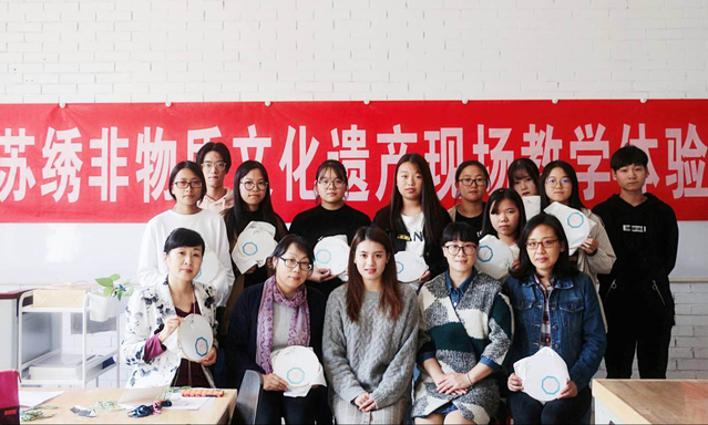 報(bào)告會后,在人文藝術(shù)系的藝術(shù)工坊開展了蘇繡技藝體驗(yàn)活動(dòng)。郁老師對藝術(shù)專業(yè)部分師生進(jìn)行現(xiàn)場教學(xué),學(xué)習(xí)蘇繡的基本種類、針法和技巧,師生們在刺繡的同時(shí)深入體驗(yàn)了蘇繡的魅力。