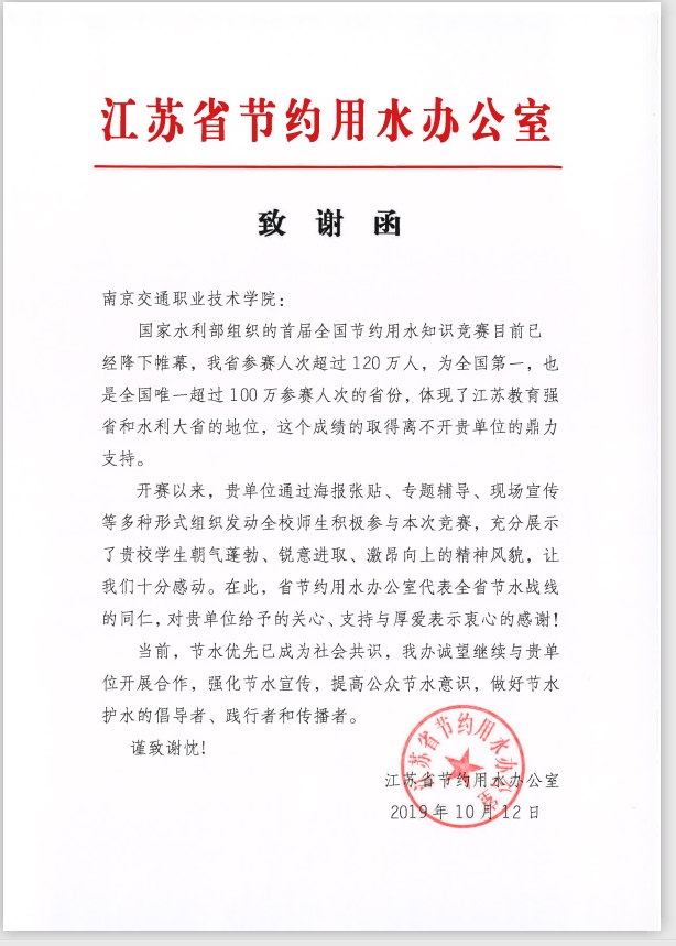 江蘇省節(jié)水辦近日向?qū)W院發(fā)來致謝函,高度肯定了學(xué)院組織參加全國節(jié)約用水知識(shí)大賽成效,感謝學(xué)院的支持和貢獻(xiàn)。全國節(jié)約用水知識(shí)大賽于9月中旬至10月中旬開展,學(xué)院按照省節(jié)約用水辦公室和省保護(hù)母親河領(lǐng)導(dǎo)小組辦公室部署,統(tǒng)籌安排,以各院系團(tuán)組織為單位整體推進(jìn),積極發(fā)動(dòng)學(xué)生參與。在廣泛宣傳動(dòng)員基礎(chǔ)上,以環(huán)保類社團(tuán)和各級(jí)團(tuán)學(xué)骨干為主體組建了重點(diǎn)參賽團(tuán)隊(duì),同時(shí)廣泛動(dòng)員學(xué)生參與,先后有5000余人次參賽,為江蘇參賽人次位居全國第一的優(yōu)異組織成效提供了有力支持。