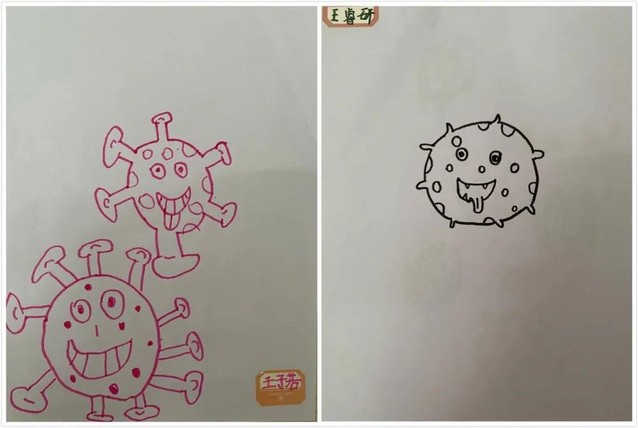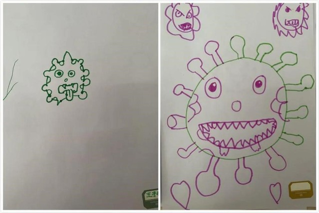 (志愿者幫助年齡較小的孩子學(xué)習(xí)畫新冠病毒小怪獸)