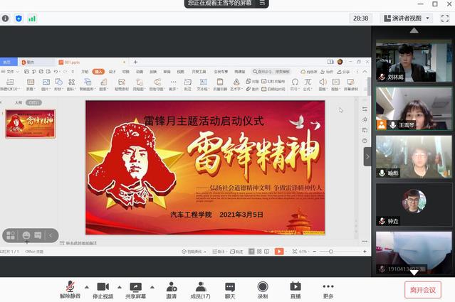 為了學習雷鋒同志的先進事跡,在青年大學生中發(fā)揚光大“雷鋒精神”,進一步推進社會主義核心價值體系建設(shè),深化學院思想政治教育工作,3月5日晚,學院團總支組織全體學生會干部在線上召開了“雷鋒月主題活動”啟動儀式。會議由團總支書記王雪琴老師主持。