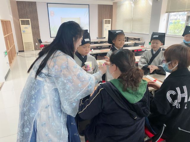 志愿者們幫助小朋友們一起穿上中華傳統(tǒng)服飾,為小朋友們和家長們介紹了清明節(jié)的由來、習俗,重點講述了清明節(jié)所承載的尊祖敬宗、祭祀親孝、繼志述事的精神文化?;顒又校驹刚邆冞€為小朋友們一一示范了傳統(tǒng)敬茶的禮儀,教會小朋友們?nèi)绾蜗蚋改搁L輩們敬茶,指導小朋友們禮繪“心”字,讓小朋友們在畫紙上描寫心字,表達對父母的感恩之心,感受孝由“心”生,最后他們還帶領小朋友們一起做禮儀功夫操,讓小朋友們在肢體動作中體會中華傳統(tǒng)禮儀。