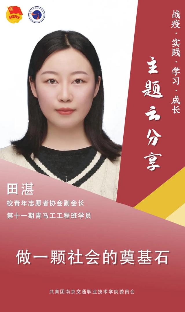 本期的“戰(zhàn)‘疫’·實(shí)踐·學(xué)習(xí)·成長”主題云分享活動(dòng),我們邀請(qǐng)到校青馬工程班學(xué)員,校青年志愿者協(xié)會(huì)副會(huì)長田湛同學(xué),下面請(qǐng)跟隨團(tuán)團(tuán)走進(jìn)田湛同學(xué)的云分享。