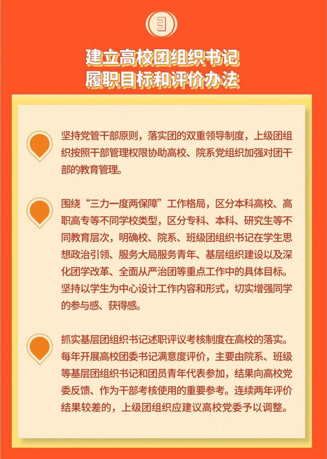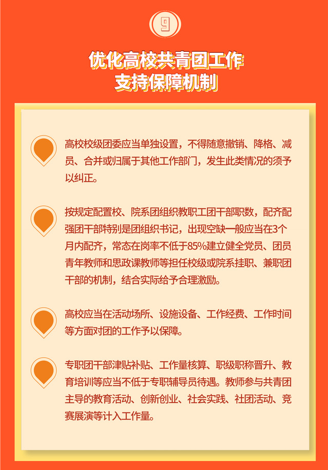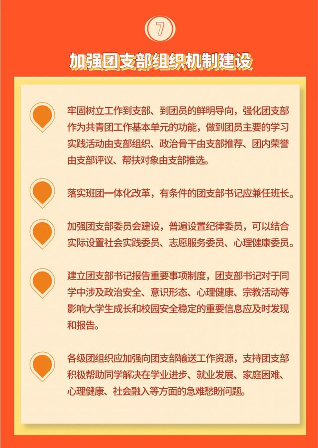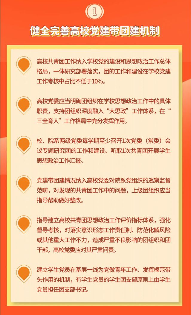 文件指出,高校共青團(tuán)工作是高校黨的建設(shè)和思想政治工作的重要組成部分,事關(guān)落實教育立德樹人根本任務(wù),事關(guān)共青團(tuán)履行為黨育人政治職責(zé)。要健全完善高校黨建帶團(tuán)建具體機(jī)制,高校黨委應(yīng)當(dāng)拿出極大精力抓共青團(tuán)工作,將高校共青團(tuán)工作納入學(xué)校黨的建設(shè)和思想政治工作總體格局,明確團(tuán)組織在學(xué)校思想政治工作中的具體職責(zé)。建立學(xué)生黨員在基層一線為黨做青年工作、發(fā)揮模范帶頭作用的機(jī)制,有學(xué)生黨員的學(xué)生團(tuán)支部原則上由學(xué)生黨員擔(dān)任團(tuán)支部書記。優(yōu)化工作支持保障機(jī)制,高校應(yīng)當(dāng)單獨設(shè)置校級團(tuán)委,配齊配強(qiáng)團(tuán)干部特別是團(tuán)組織書記,在活動場所、設(shè)施設(shè)備、工作經(jīng)費(fèi)、工作時間等方面對團(tuán)的工作予以保障。