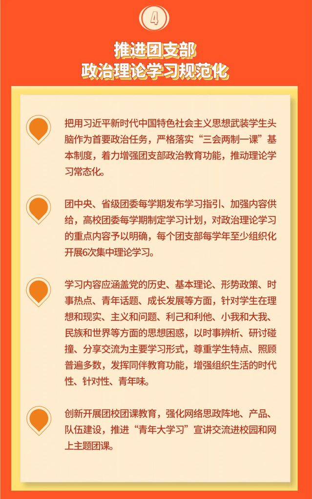 文件要求,要推進(jìn)團(tuán)支部政治理論學(xué)習(xí)規(guī)范化,把用習(xí)近平新時代中國特色社會主義思想武裝學(xué)生頭腦作為首要政治任務(wù),嚴(yán)格落實“三會兩制一課”基本制度,著力增強(qiáng)團(tuán)支部政治教育功能,推動理論學(xué)習(xí)常態(tài)化。開展經(jīng)常性、有組織的社會實踐,統(tǒng)籌校內(nèi)校外共青團(tuán)組織資源,以團(tuán)支部為基本單位,有計劃、大批量、小規(guī)模、經(jīng)常性地組織青年學(xué)生開展社會觀察和實踐,培養(yǎng)家國情懷,增長社會化能力。持續(xù)提升共青團(tuán)員的精神素養(yǎng)和斗爭本領(lǐng),引導(dǎo)團(tuán)員到祖國最需要的地方和基層一線建功立業(yè),在社會生活中彰顯奮斗精神、體現(xiàn)團(tuán)員先進(jìn)性。加強(qiáng)團(tuán)支部組織機(jī)制建設(shè),牢固樹立工作到支部、到團(tuán)員的鮮明導(dǎo)向,強(qiáng)化團(tuán)支部作為共青團(tuán)工作基本單元的功能,做到團(tuán)員主要的學(xué)習(xí)實踐活動由支部組織、政治骨干由支部推薦、團(tuán)內(nèi)榮譽(yù)由支部評議、幫扶對象由支部推選。