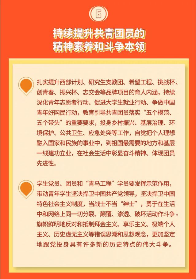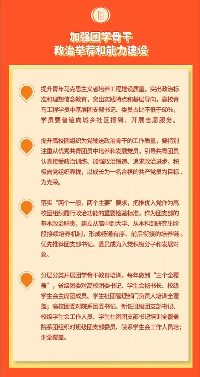 文件強(qiáng)調(diào),要加強(qiáng)團(tuán)學(xué)骨干政治舉薦和能力建設(shè),提升青年馬克思主義者培養(yǎng)工程建設(shè)質(zhì)量,突出政治標(biāo)準(zhǔn)和理想信念教育,突出實踐特點和基層導(dǎo)向。提升高校團(tuán)組織為黨輸送政治骨干的工作質(zhì)量,落實“兩個一般、兩個主要”要求,把推優(yōu)入黨作為高校團(tuán)組織履行政治功能的重要檢驗標(biāo)準(zhǔn),作為團(tuán)支部的基本政治職責(zé),建立從高中到大學(xué)、從本科到研究生階段接續(xù)培養(yǎng)機(jī)制,形成暢通有序、前后銜接的培養(yǎng)鏈條。分層分類開展團(tuán)學(xué)骨干教育培訓(xùn),每年對高校各級團(tuán)組織、學(xué)生會、學(xué)生社團(tuán)負(fù)責(zé)人和相關(guān)工作人員實現(xiàn)全覆蓋。
