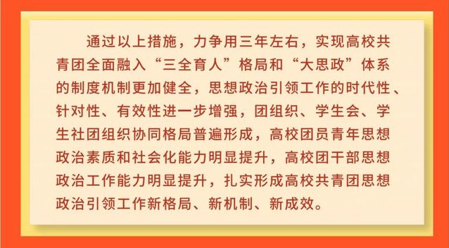 文件提出,力爭用三年左右,實現(xiàn)高校共青團(tuán)全面融入“三全育人”格局和“大思政”體系的制度機(jī)制更加健全,思想政治引領(lǐng)工作的時代性、針對性、有效性進(jìn)一步增強(qiáng),團(tuán)組織、學(xué)生會、學(xué)生社團(tuán)組織協(xié)同格局普遍形成,高校團(tuán)員青年思想政治素質(zhì)和社會化能力明顯提升,高校團(tuán)干部思想政治工作能力明顯提升,扎實形成高校共青團(tuán)思想政治引領(lǐng)工作新格局、新機(jī)制、新成效。