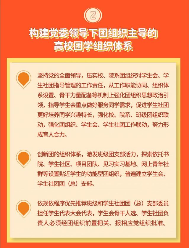 文件強(qiáng)調(diào),要構(gòu)建黨委領(lǐng)導(dǎo)下團(tuán)組織主導(dǎo)的高校團(tuán)學(xué)組織體系,堅持黨的全面領(lǐng)導(dǎo),強(qiáng)化團(tuán)組織的政治功能,壓實校、院系團(tuán)組織對學(xué)生會、學(xué)生社團(tuán)指導(dǎo)管理的工作責(zé)任,從工作職能協(xié)同、組織體系設(shè)置、骨干力量配備等機(jī)制上強(qiáng)化團(tuán)組織思想政治引領(lǐng),指導(dǎo)學(xué)生會重點做好服務(wù)同學(xué)需求,促進(jìn)學(xué)生社團(tuán)更好培養(yǎng)同學(xué)興趣特長,努力形成育人合力。建立高校團(tuán)組織書記履職目標(biāo)和評價辦法,明確校、院系、班級團(tuán)組織書記具體目標(biāo),堅持以學(xué)生為中心設(shè)計工作內(nèi)容和形式,抓實基層團(tuán)組織書記述職評議考核制度在高校的落實。