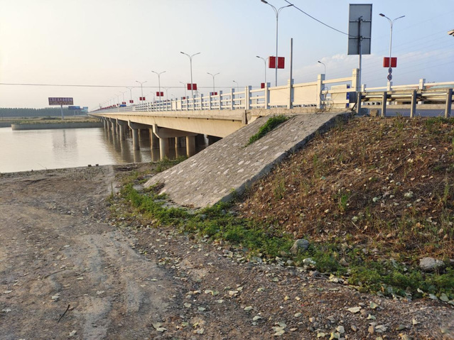 新沂河大橋不但造型美觀,而且具有民族特色。在沂河大橋的西邊約2000米,于1995年興建溝通新長鐵路的鐵路大橋,在沂河大橋的東邊約3000米,有一座京滬高速公路大橋,這三座大橋如同彩虹,橫跨新沂河上?,F(xiàn)在每晝夜鐵路、公路、高速公路混合交通量極大。對溝通南北交通和國防運輸起了巨大作用,也是沭陽縣新沂河上亮麗的風(fēng)景線。