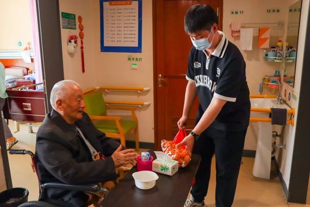 演出結束后,志愿者們與老人促膝圍坐,聆聽老人們在養(yǎng)老院中的生活狀況和身體情況,并將腿腳不便的老人推到院中曬太陽,小院中一片歡聲笑語。同時,志愿者為每一位老人送去了糕點和水果,送去了我們的慰問與祝福,并叮囑他們保重身體,保持積極樂觀心態(tài)。