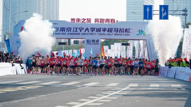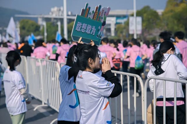 南京江寧大學(xué)城半程馬拉松在體育中心南門鳴槍起跑,我院志愿者助力此次馬拉松比賽