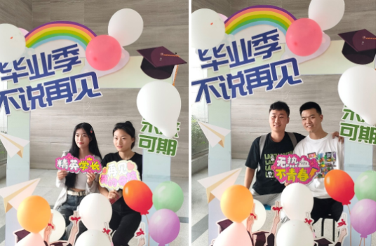 “畢業(yè)是千萬(wàn)個(gè)夏天的故事,千萬(wàn)個(gè)人,千萬(wàn)個(gè)不同的夏天”,畢業(yè)生們來(lái)到異形打卡板前,合影留念,留住這個(gè)夏天的美好往事。