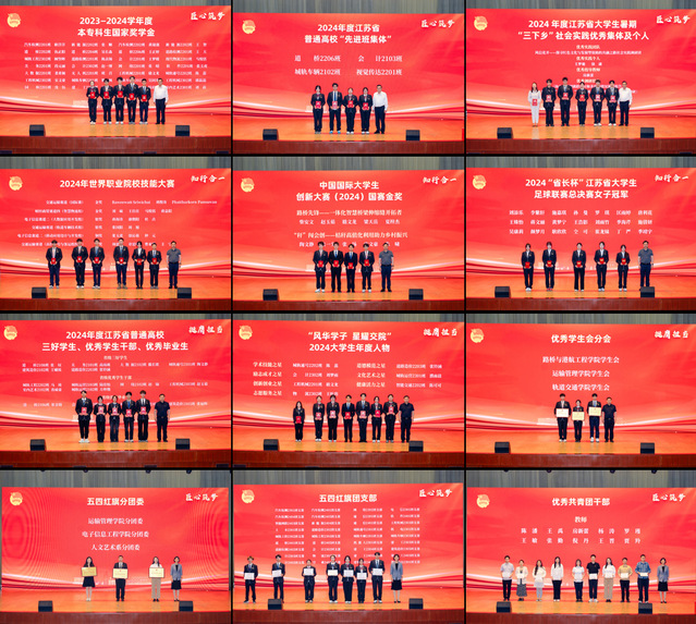 在五四表彰環(huán)節(jié),大會以“匠心筑夢”“知行合一”“挺膺擔(dān)當(dāng)”三個篇章展開,對過去一年在思想引領(lǐng)、技能競賽、社會實(shí)踐等領(lǐng)域表現(xiàn)突出的集體和個人進(jìn)行表彰。黨委書記張毅、院長王道峰等領(lǐng)導(dǎo)為獲獎代表頒獎?!拔逅募t旗分團(tuán)委”“江蘇省先進(jìn)班集體”“國家獎學(xué)金”等集體與個人榮譽(yù)表彰,彰顯組織建設(shè)與學(xué)業(yè)標(biāo)桿力量;全國交通運(yùn)輸行業(yè)技能大賽、中國國際大學(xué)生創(chuàng)新大賽、世界職業(yè)院校技能大賽等賽事獲獎代表上臺領(lǐng)獎,詮釋“技能成才、強(qiáng)國有我”的青春誓言;“十佳共青團(tuán)員”“十佳青年志愿者”“2024大學(xué)生年度人物”等榮譽(yù)獲得者,以行動踐行責(zé)任擔(dān)當(dāng),傳遞向善力量。