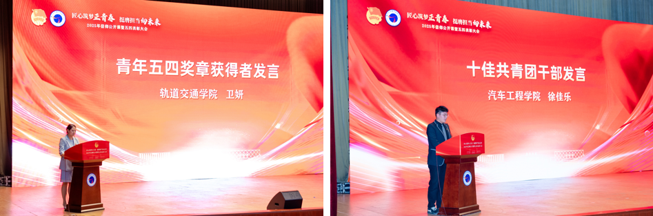“十佳共青團(tuán)干部”徐佳樂同學(xué)、“青年五四獎?wù)隆鲍@得者衛(wèi)妍老師分別作為獲獎代表發(fā)言,分享了立足專業(yè)、勇?lián)姑那啻汗适隆?/p>