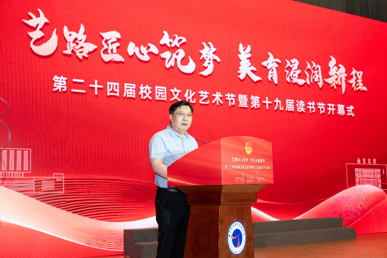 王道峰院長發(fā)表了熱情洋溢的開幕致辭,他強調,文化鑄就校園底蘊,藝術涵養(yǎng)治學精神,校園要有文化,才會有文明的底蘊;校園更要有藝術,才會有精神的靈動。校園文化藝術節(jié)和讀書節(jié)不僅是展示才華的舞臺,更是深化文化育人的重要平臺,是學校落實立德樹人根本任務、踐行“五育并舉”教育方針的生動實踐。王院長寄語全院師生:一是要以藝術為筆,繪就匠心底色,在藝術實踐中錘煉專注與創(chuàng)新的工匠精神;二是要以閱讀為帆,駛向智慧深海,讓書香成為校園最美的底色;三是要以行動為炬,照亮時代征程,在實現中華民族偉大復興的征程中貢獻青春力量。