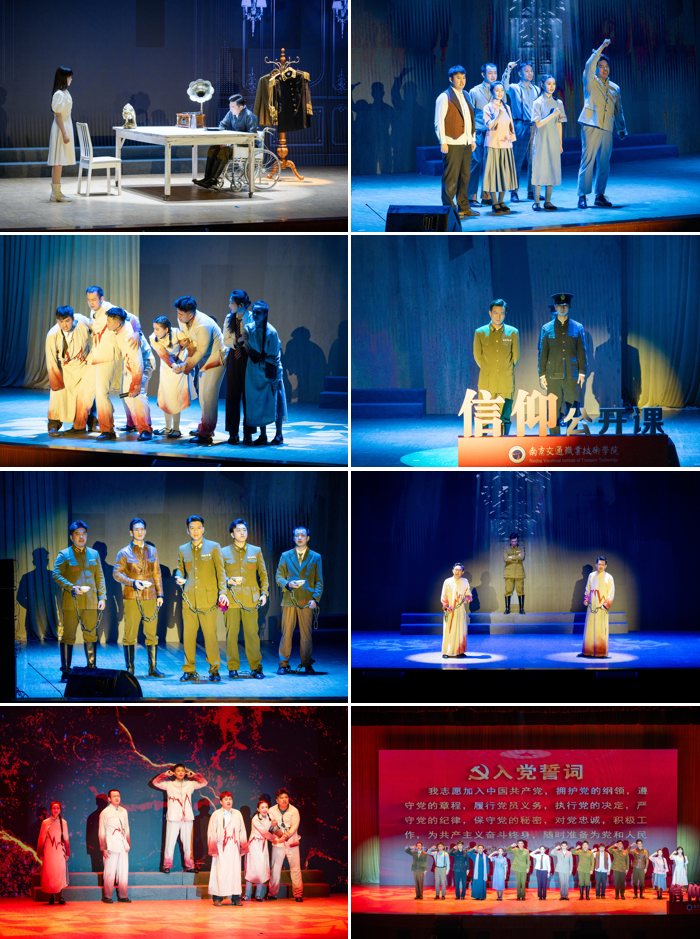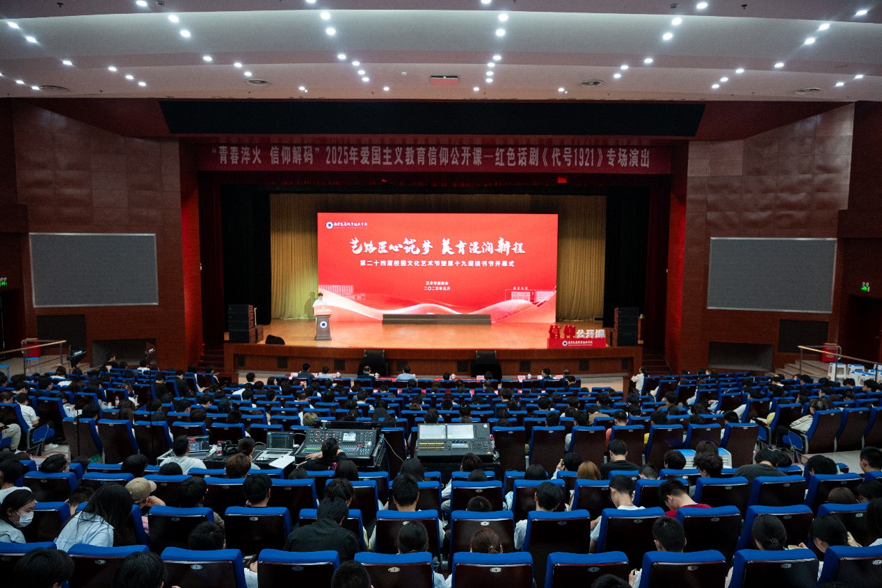 在開幕式上,開展了“青春淬火 信仰解碼”2025年愛國主義教育信仰公開課,全體師生共同觀看了由南京雨花劇院帶來的浸沒式紅色話劇《代號1921》,表演再現了革命者用熱血書寫忠誠、用生命詮釋信仰的壯烈篇章。演員精湛的演繹與創(chuàng)新的舞臺設計,讓在場的師生跨越時空與歷史對話,在震撼與共鳴中接受了一次生動的愛國主義教育。