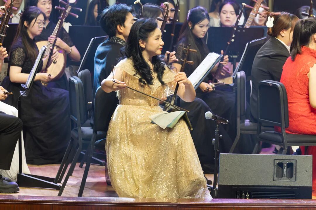 音樂會在熱烈的掌聲中啟幕。南京曉莊學院音樂學院民樂團為現(xiàn)場師生呈現(xiàn)了十首風格多元的經(jīng)典與新創(chuàng)民樂作品,曲目安排匠心獨具。既有渲染節(jié)日喜慶氛圍的《金蛇狂舞》,也有由曉莊學子獨唱、教師京胡伴奏,與民樂團共同演繹的戲曲選段《梨花頌》。