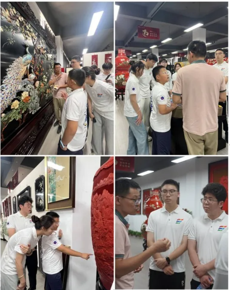 活動中,實踐團在韓鋒老師帶領(lǐng)下走進漆器廠展覽館,仿佛穿行于時空長廊,觸摸千年漆藝的發(fā)展脈絡(luò)。展廳內(nèi)展品琳瑯滿目,大型漆藝屏風《喜鵲登梅》尤為奪目:梅花或含苞如胭脂,或盛放似白雪,紋理精致若暗香浮動;枝頭喜鵲或梳羽振翅,或昂首高歌,神態(tài)靈動。作品動靜相襯,巧融自然生機與人文雅韻,令隊員們駐足沉醉。此外,花鳥魚蟲、山水風景等意象被巧妙融入各類漆器擺件,盡顯揚州漆器精巧細膩的工藝之美。