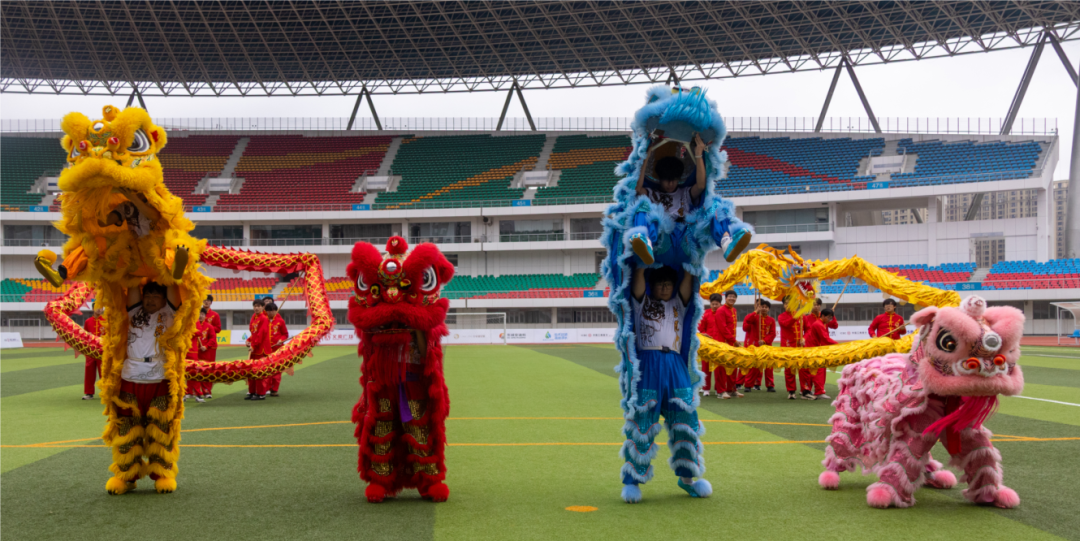首先,由我校龍獅社帶來的開場表演《龍獅鼓韻》震撼全場,學子們身著特色服飾,整齊列隊,領(lǐng)鼓號令一響,鏗鏘鼓樂驟然迸發(fā),民俗磅礴與賽事熱血交融,瞬間點燃全場,為足球盛宴啟幕。