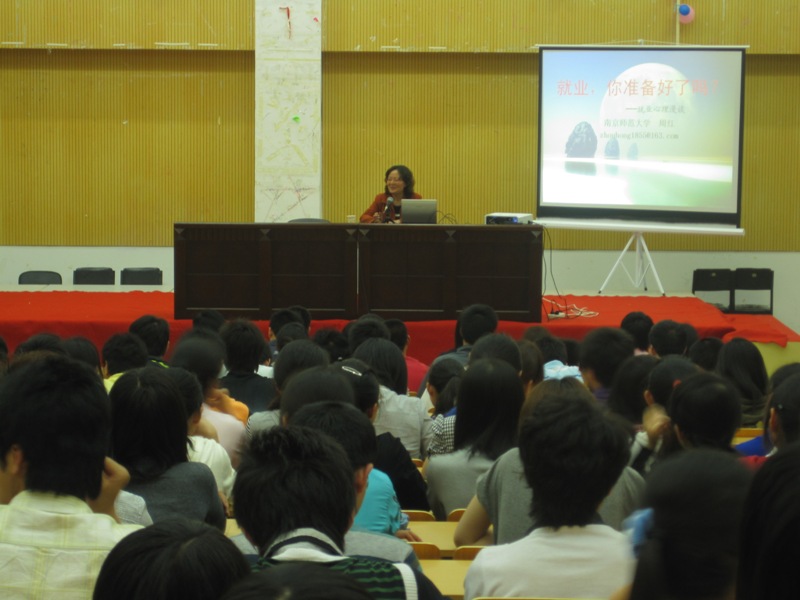為了有效地緩解我院學(xué)生的就業(yè)心理壓力,增強(qiáng)就業(yè)信心,樹立正確積極的就業(yè)觀, 5月18日晚7點,學(xué)院邀請到教育廳仙林大學(xué)城心理健康教育研究中心、南京師范大學(xué)心理健康教育咨詢中心主任周紅教授為學(xué)生作了大學(xué)生就業(yè)常見心理問題及輔導(dǎo)的講座。約400余名學(xué)生到場聆聽。